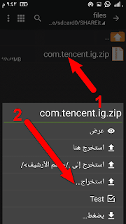 نضغط أرسال تم ملفات تم سعة التخزين الداخلية Android ثم data ثم ملف com.tencent.ig..zip ونقوم بأرساله إلى الهاتف الأخر.